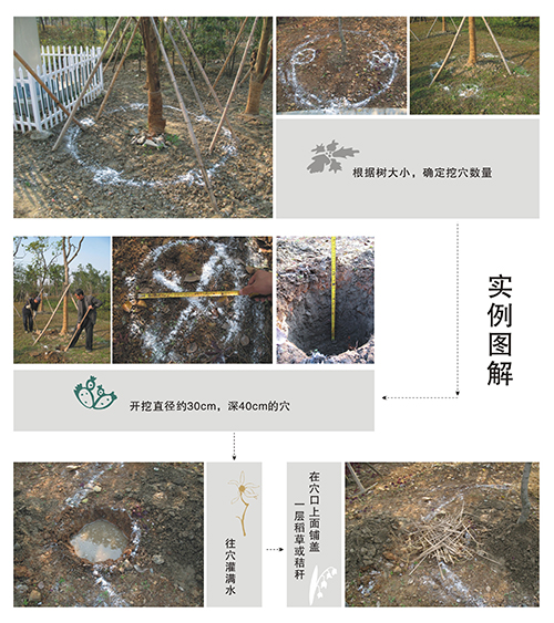 在樹冠滴水線(垂直投影輪廓線)附近開挖直徑約30cm,深40~60cm的穴(沙質(zhì)土宜淺,黏質(zhì)土宜深,但以不傷樹根為佳),穴的數(shù)量依樹大小而定(如Φ<10cm挖2個(gè)穴,10cm≤Φ<20 cm 挖3~4個(gè)穴,20cm≤Φ<40 cm挖6~8個(gè)穴),然后往穴內(nèi)灌滿水,最后在穴口上面鋪蓋一層稻草或秸稈,以減少水分蒸發(fā)損耗,進(jìn)行抗旱時(shí)直接往穴內(nèi)灌水即可。