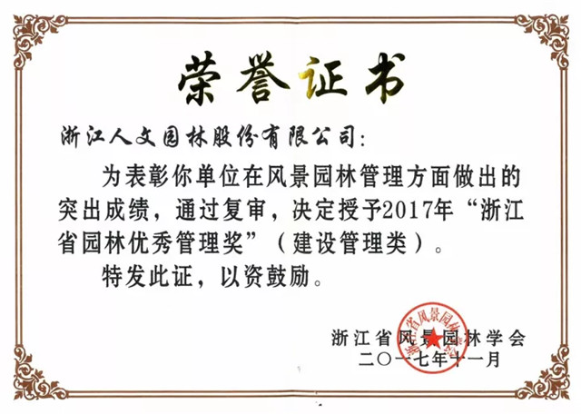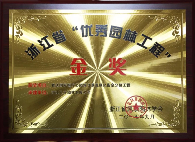 “雅達國際醫療公園項目景觀綠化指定分包工程”、“鄭州怡商花園式商務會館項目綠化及硬質景觀工程一標段”榮獲2017年度浙江省“優秀園林工程”金獎;