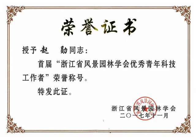 浙江人文園林股份有限公司趙勛被評為“浙江省風景園林學會優秀青年科技工作者 ”。