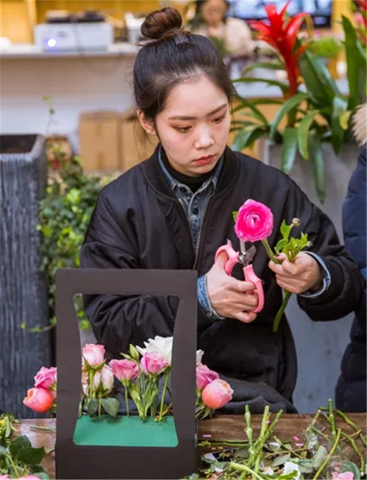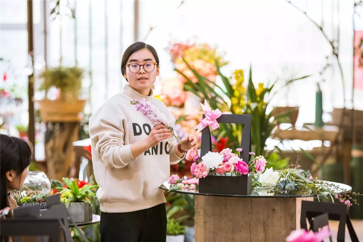 花藝師通過現場示范,給大家認真講解了花藝架構及花籃制作的要點。學員們全神貫注,聽得津津有味,講解一結束,就迫不及待地動手操作起來,將一束束春天,通過自己的巧手裝進花籃,提回家中。