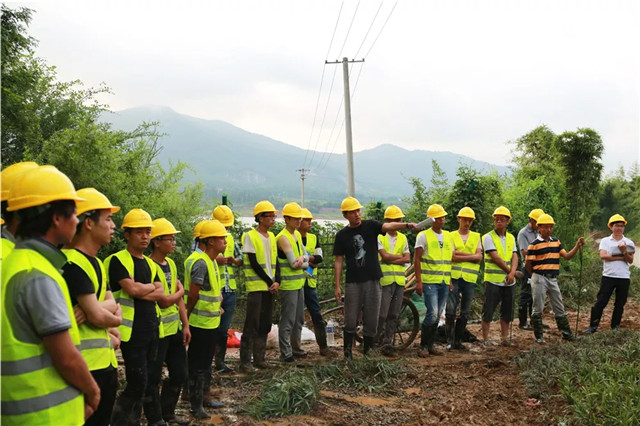 施工方案的討論及確定、場(chǎng)地的整理、隊(duì)伍的磨合費(fèi)去了不少時(shí)間。第二天傍晚突然下起了雨,為了趕工期,大家冒雨作業(yè),一刻也不停歇,直到殘蟬噪晚、夜幕降臨。