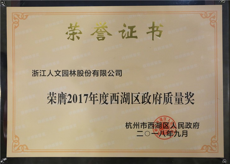 9月29日,2017年西湖區(qū)政府質(zhì)量獎(jiǎng)?lì)C獎(jiǎng)暨2018年西湖區(qū)政府質(zhì)量獎(jiǎng)啟動(dòng)儀式在西資大樓舉行,會(huì)議由西湖區(qū)市場(chǎng)監(jiān)管局副局長(zhǎng)陳志遠(yuǎn)主持,副區(qū)長(zhǎng)繆凌蓉,區(qū)市場(chǎng)監(jiān)管局局長(zhǎng)、區(qū)政府質(zhì)量獎(jiǎng)評(píng)審辦主任李建群等領(lǐng)導(dǎo)及50多家西湖區(qū)名優(yōu)企業(yè)代表參加。浙江人文園林股份有限公司不負(fù)眾望,從西湖區(qū)兩萬(wàn)多家企業(yè)中脫穎而出,榮獲2017年西湖區(qū)政府質(zhì)量獎(jiǎng),人文園林副總裁錢茜萍出席會(huì)議并代表公司領(lǐng)獎(jiǎng)。