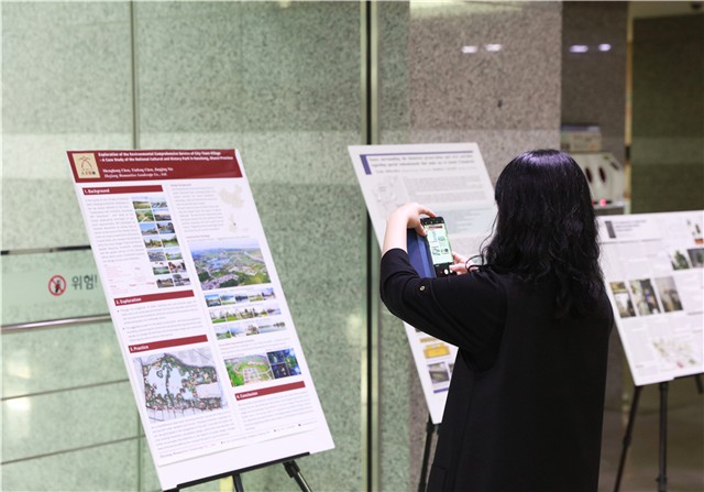 與會者觀看《“城-鎮-村”環境綜合服務實踐探索—以陜西省韓城市國家文史公園為例》一文壁報