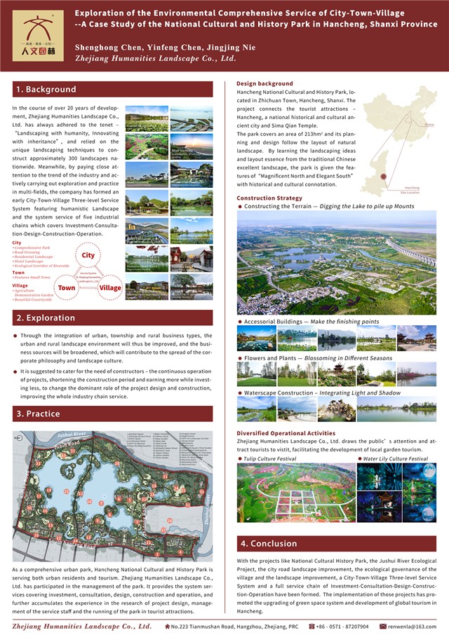 10月2日至4日,第十六屆中日韓風景園林學術研討會在韓國首爾市召開。浙江人文園林股份有限公司派代表參加了本次會議,公司《“城-鎮-村”環境綜合服務實踐探索—以陜西省韓城市國家文史公園為例》一文被錄用,并在會議的壁報展示環節中進行了展示。
