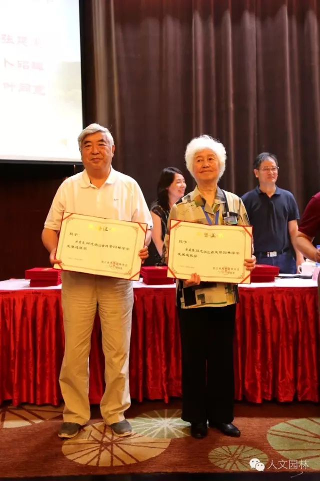 此次大會(huì)中,園林伉儷施奠東先生和劉延捷老師獲得浙江省風(fēng)景園林學(xué)會(huì)“發(fā)展成就獎(jiǎng)”,榮獲此獎(jiǎng)項(xiàng)的還有林福昌、張延惠、陳樟德、馮祥珍、胡理琛、卜昭暉、劉茂春、宋玉琪、裘寶林、葉同寬、潘仲連等31名園林專家,以表彰他們?yōu)檎憬★L(fēng)景園林的發(fā)展做出的杰出貢獻(xiàn)。 園林伉儷施奠東、劉延捷獲得省風(fēng)景園林學(xué)會(huì)“發(fā)展成就獎(jiǎng)”